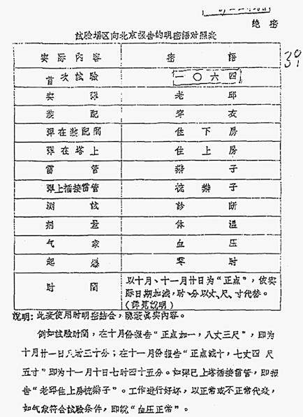 关于第一颗原子弹,还有个被经常提及的问题就是关于它的通讯密语(也叫“暗语”)究竟是什么。密语跟代号不是一回事,使用的范围很窄,仅仅用于试验现场跟中央通讯联络;而且使用的时间很短,是在试验前半个多月的1964年9月23日才制定出来。