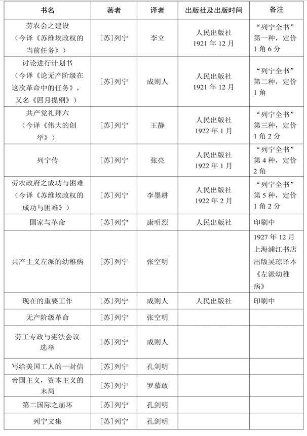 1921年11月发布的《中国共产党中央局通告》对宣传工作作出重要指示,明确提出“中央局宣传部在明年七月以前必须出书(关于纯粹的共产主义者)二十种以上。”人民出版社成立一年多的时间里,共出版14种马克思列宁主义图书。具体包括:“马克思全书”1部、“列宁全书”5部、“康民尼斯特丛书”4部、其他4部。从“康民尼斯特丛书”的书名及内容来看,以传播列宁经典为主,亦属于传播列宁主义的范围,故可以把“康民尼斯特丛书”视为“列宁全书”的补充系列。拟出版的“列宁全书”14种自1921年11月至次年2月,短短4个月内连续面世5种,还有2种印刷中。具体出版图景如下:
