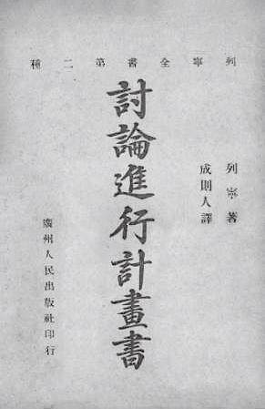 2.《讨论进行计划书》(今译《论无产阶级在这次革命中的任务》,又名《四月提纲》)。最初在国内以《讨论进行方法的文书》为名,作宣传列宁著作之用,刊登在《列宁的著作一览表》中。其初版作为“列宁全书”第二种由人民出版社于1921年12月发行。1927年该书由新青年社再版,长江书店发行。