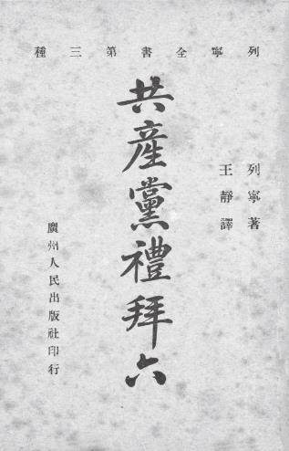 3.《共产党礼拜六》(今译《伟大的创举》)。该书目前珍藏在北京大学,为8本德文版亢慕义斋藏书之一种。《共产党礼拜六》起初仅作为北京大学马克思研究会内部图书,是会员学习马克思列宁主义理论的辅导书籍。1920年7月1日《少年世界》第1卷第7号“妇女号”刊登叔愚节译的《伟大的创举》,标题为《李宁对俄罗斯妇女解放的言论》,叔愚在译者序提到:“去年李宁发布的一本小册子,叫做《伟大的开端》The Great Beginning,里面有一段关于苏维埃俄罗斯妇女解放的经过,现状,和前途。……我现在把他介绍出来,或者也可以供我们一班热心妇女解放的诸君,一点参考资料罢!”首个中译本作为“列宁全书”第三种,于1922年1月由人民出版社出版。