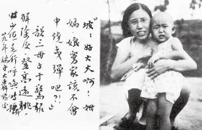 姑父、姑妈和表哥克行眼看着江北上清寺一带遭遇前所未有的大轰炸,火光冲天,十分担心我们一家。姑妈带着克行惊恐万状呼唤时,姑父拿着相机拍下了那一瞬间,并在照片背面,以两岁小克行的口吻写道:“坡坡好大火啊!姆妈,娘舅家该不会中烧夷弹吧?!”并描写了当时的情景:“韵三母子于警报解除后,登高远眺,正值克行呼唤时摄。廿九年端午大轰炸后”。