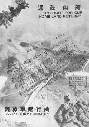 爱泼斯坦在《人民之战》中指出,聂耳在中国乐坛的横空出世,“显示着中国被压迫的底层大众中隐藏着巨大的天才”,《义勇军进行曲》唱出了人民的“抵抗之歌”。1935年6月1日,《电通半月画报》推出“风云儿女特辑”,封二刊登以长城和义勇军为背景的《义勇军进行曲》曲谱,画面上方题写“还我山河”和“Let’s fight for our home-land return”的中英文标语,右下方配以孙师毅所作《风云儿女序诗》:
