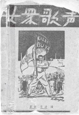 1936年10月,麦新、孟波编选刊行了抗战救亡歌曲集《大众歌声》第1集,歌曲集的封面是丁里创作的木刻画,一位身形高大、神情坚毅的工人高擎起一面用拉丁化新文字书写的“起来,不愿做奴隶的人们”的大旗。扉页上写着庄重、醒目的大字: