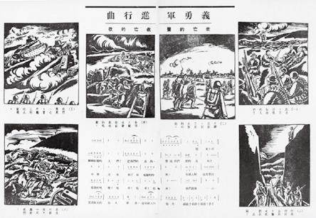 七七事变前后,由平津经过太原、大同直到国防前线,到处流传着《义勇军进行曲》。1937年9月18日,为纪念九一八事变六周年,爱泼斯坦在南京街头“第一次听到首都广播电台播放的聂耳的《义勇军进行曲》,这首歌过去在南京一直遭到禁止。我上次听到它,是在日本人统治的华北。而今天,全中国都在唱它了”。《义勇军进行曲》还被国民党军队选用为“标准军歌之一”,在台儿庄战役中,滇军第六十军从缅甸、安南边界出发,跋山涉水三千里,“他们边行军边唱歌,唱的是《义勇军进行曲》”。丰子恺以其逃难时的切身经历,讲述《义勇军进行曲》传唱大江南北的盛况:
