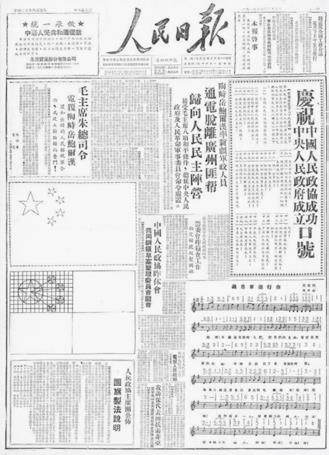 9月27日,中国人民政治协商会议第一届全体会议通过《关于中华人民共和国国都、纪年、国歌、国旗的决议》,决定在中华人民共和国的国歌未正式制定前,以《义勇军进行曲》为国歌。《人民日报》记者李庄在通讯《未来是属于我们的》中这样写道:“十几年前,它鼓舞了全中国人民的战斗热情,今后,它将鼓舞我们继续胜利前进,建设一个幸福的新国家。”