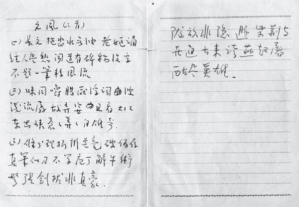 我手头保存有他从小笔记本上扯下来给我的《文风》三首手稿。其一曰:“长文拖沓水无油,老妪诵经人尽愁。闻道有碑称没字,不题一笔转风流。”其二曰:“味同嚼蜡厌浮词,波浅流孱故弄姿。且看大江东出峡,苍苍莽莽自雄奇!”其三曰:“条分理(缕)析辨芒毫,破伪存真笔似刀。不学庖丁解牛术,弩张剑拔非真豪。”半是针砭当时盛行的假、大、空文风,半是表明自己的主张—这些主张都是自己几十年写作的经验之谈。以诗论文,都很精彩。胡绳在“五七干校”收到叶圣陶的信,内附论诗的诗若干首,胡绳有感而发,以这几首酬答。