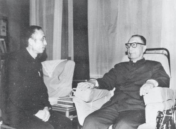 1986年7月1日,我第一次去拜望表叔。这天,江津县委书记辜文兴带领我们一行去北京玉泉山表叔寓所看望他老人家,向他汇报家乡的建设情况,大家的心情既高兴,又激动,更紧张。但一见到他老人家,他那和蔼可亲、平易近人的神态,就使我们紧张的心情平静下来。老人家坐在轮椅上,高兴地举着双手欢迎我们。当听了我们转达家乡人民对他的祝福后,老人家深情地说:“我也想念家乡呀!我1956年回去过,那次是为了军工生产,到了江津,住在城关,很快(两天)就走了……转瞬又是几十年了,我想念家乡呀,但不得回去,人愈老愈想乡情呀,很想家乡,现在年纪大了,也不能动了,想念也是空话了,也不能回去,唉!托你们向乡亲们问好……”他又说:“我这个情况,动都动不得,老了,88岁了,20岁离开家乡,68年没有回到家乡了。”