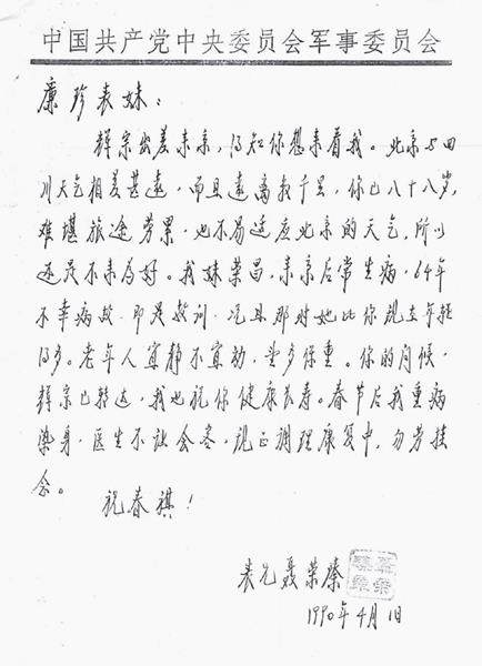1990年3月中旬,我又一次到北京出差,我请周秘书向表叔转报,我母亲想来北京看望他。27日上午,周秘书告诉我说:“首长说能见见当然好。”周秘书又说,时间要定在气温回升以后。三天后,周秘书又给我说:“你母亲来北京一事,我又一次给老人家说了,第一次,他老人家说:亲戚就那么一位了,能见见,当然好。所以,那天我说你母亲来的时间要和龙必涛、聂荣祥他们来的时间分开……昨天我汇报这事时首长又说:提到这件事,我真思绪万千,非常矛盾啊,没有什么亲戚了,几十年不见,见一见,当然好,但她也八十几岁了,长途劳累,能吃得消吗?万一……”表叔担心我母亲受不了长途劳累和不能适应南北温差。他给我母亲写了一封信,要我母亲“不来为好”,表叔在信中说:“我妹妹荣昌来京后,常生病。1964年不幸病故,即是教训……”他还嘱咐我,要我一定向母亲进行劝慰和解释,语调和神情带着深深的遗憾和对家乡亲人的无尽思念。
