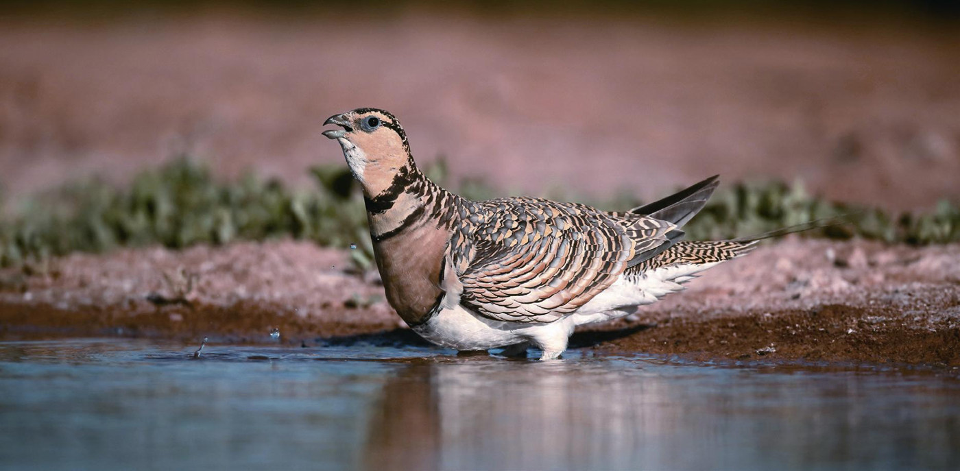白腹沙鸡分布于欧洲南部、非洲北部、亚洲西部和南部等地。它属于中型鸟类,体长三四十厘米;羽色较斑驳,以灰色、棕色、黑色、黄绿色等为主,与荒漠的色调十分协调,便于隐蔽自己;翅膀长而尖,振翅呼呼有声;嘴的形状与家鸡相似,但小而啄力弱。虽然名字中有“鸡”字,但白腹沙鸡与鸡类的亲缘关系比较远,而与鸠鸽类的亲缘关系比较近。在最新的分类系统中,沙鸡类已被归为单独的沙鸡目中。