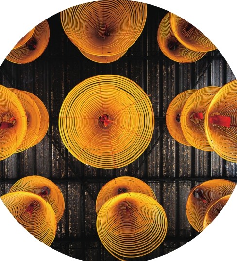 在制香工艺上,线香与篆香是有所关联的。篆香是以末香(捣成细末状的沉香、檀香等)铺成首尾相连的纹路或图案,是不规则的线状香。线香则指无竹芯的香,也叫直条香,由木材香粉、黏合剂和各种香料一起做成的香品。由于线香是通过燃烧来发挥作用,所以与传统隔火熏香“闻香不见烟”的优雅蕴藉、内敛含蓄大为不同。