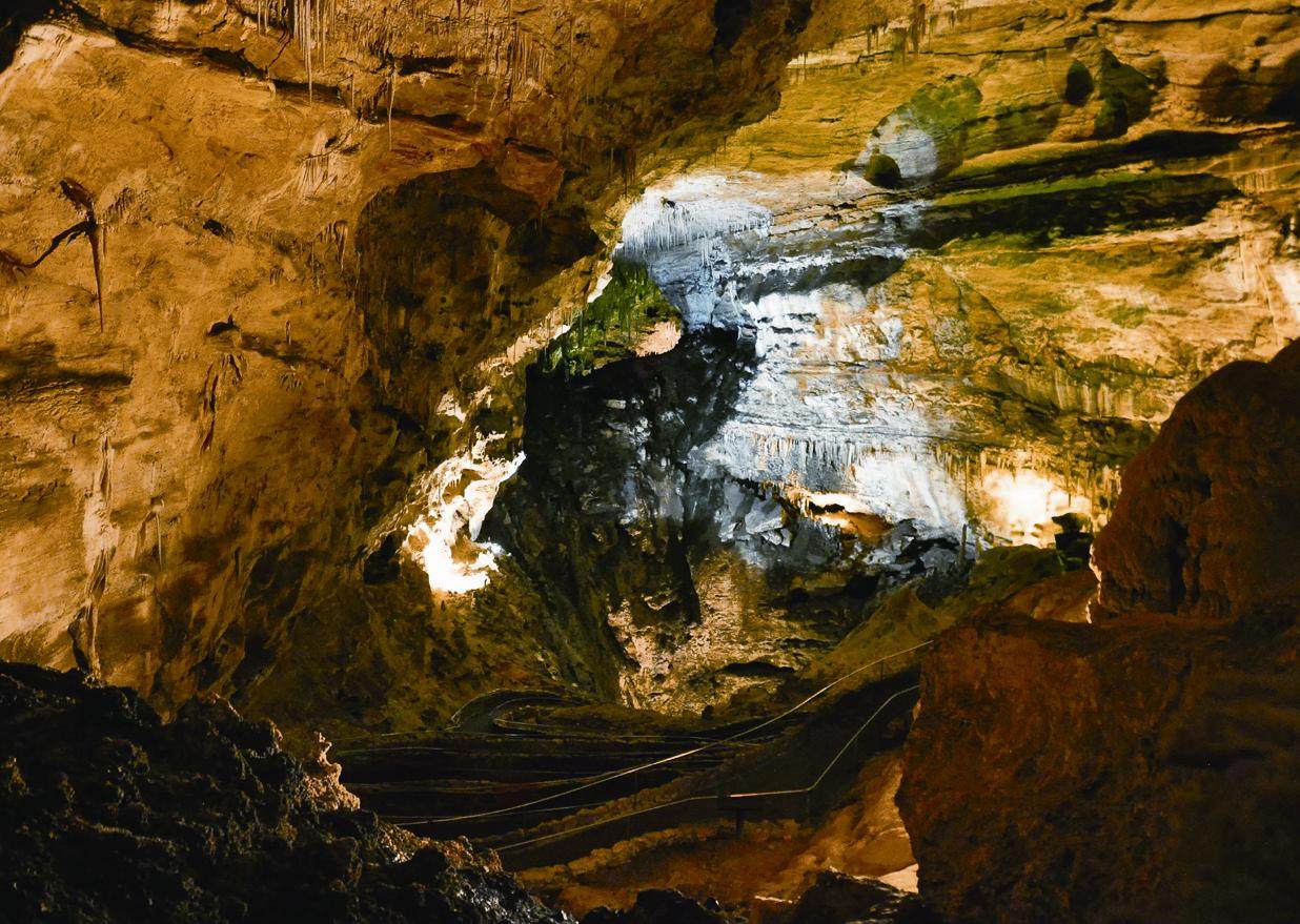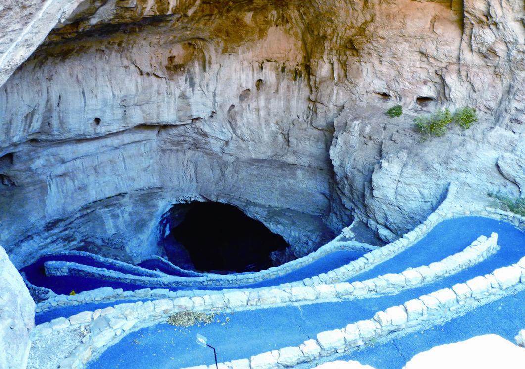 出乎意料的是,进入公园后,公路便向山上蜿蜒,这和我们期待的地下洞穴似乎有些南辕北辙。来到山顶我们才发现,在一处长满仙人掌的巉岩下,豁然出现了一个黝黑的椭圆形洞口,这便是卡尔斯巴德洞穴的自然入口。洞口外设有多排座椅,这是为方便游客在夏季傍晚观赏约100万只墨西哥犬吻蝠如黑云般集体飞出洞口的盛景。洞口比我们所站的地方低数十米,小径“之”字形紧密盘旋了十多次,才隐入黑暗之中。