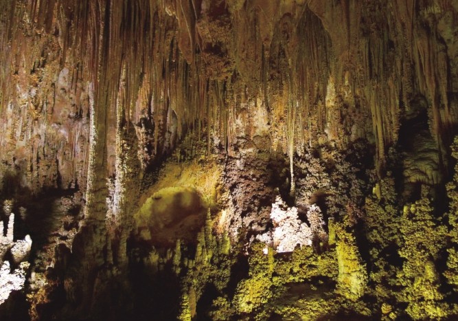 美国新墨西哥州东南角荒凉的奇瓦瓦沙漠中,坐落着大名鼎鼎的卡尔斯巴德洞穴国家公园,园中已发现的洞穴多达119个,尤以卡尔斯巴德洞穴和雷修古拉洞穴最为著名。前者不仅是美国最深的石灰岩洞穴,还拥有全球第七大的洞厅;除体量巨大外,这一洞穴还以美丽而丰富的沉积物闻名全球:缤纷的鹅管,浑圆的穴珠,宽大的石旗、石幔,顶天立地的石笋、石瀑……环顾四周,令人目不暇接。不对游客开放的雷修古拉洞穴为全球第七长洞,洞中沉积物的稀有程度比起卡尔斯巴德洞穴可谓有过之而无不及:长达6米的雪白石膏晶花从洞顶分枝而下,绝冠全球;这里还拥有全球种类最多的生物辅助沉积物,连美国国家航空航天局的科学家也曾到此探寻火星生物的奥秘。1995年,卡尔斯巴德洞穴国家公园这一罕见的地下宝库被列入《世界遗产名录》,成为全人类的自然遗产。
