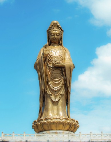 来普陀山,净高20米的南海观音铜像不可不看。该像采用仿金铜焊接而成,面如满月,左手捧法轮,右手结施无畏印,金光闪闪,高入云霄,是“海天佛国”的象征。