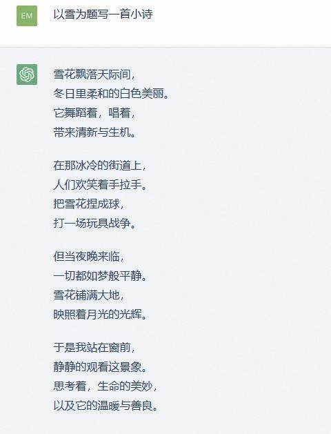 由于这些原因,ChatGPT不仅能与人们实时聊天,还能帮助人甚至替代人做很多事情。例如,它可以帮助用户写各类文字材料,包括报告、论文,各种题材的文章、诗歌;它还可以在短时间内提供大量信息、回答大量问题,既快又准又好。不过,也有一些ChatGPT生成的文本质量并不尽如人意,需要修改、补充和润色。