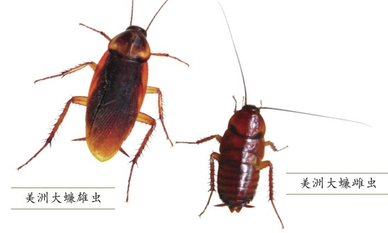美洲大蠊是一种体形较大的蟑螂,分布范围很广。雌成虫体长可达40毫米,雄成虫比雌成虫略小。美洲大蠊体色为赤褐、棕红至黑褐色;身体扁平,呈长卵圆形;前胸背板后缘有较宽的黄白色带状纹一条,中央有一块较大的暗色蝴蝶状斑块;头向下弯,隐于前胸下;口器的尖端指向后方(多数昆虫指向前方或下方);雄虫通常有两对翅,雌虫无翅或翅退化;雌虫有尾须一对,腹部比雄虫宽,雄虫有尾须两对,腹部末端生有性刺一对。