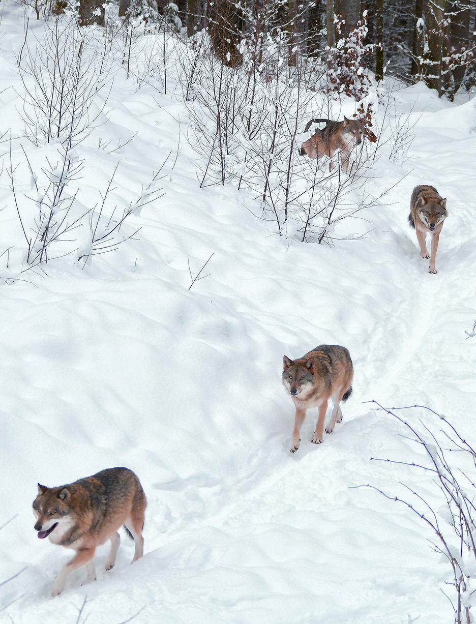 如果你看过关于狼的纪录片,就会发现一个奇特的现象,那就是狼群都是排队而行的。狼群只要出去觅食,都是一只挨一只,井然有序地前进。那么,狼群为什么要这么做呢?狼群排队而行有两个原因:一是这样的方式最适合在大草原上集体行动;二是狼是少数用尾巴来进行信息交流的动物之一?。狼群在活动的时候,都是后一只狼的头碰着前一只狼的尾巴,以此类推,狼用这种方式来彼此传达信息。?