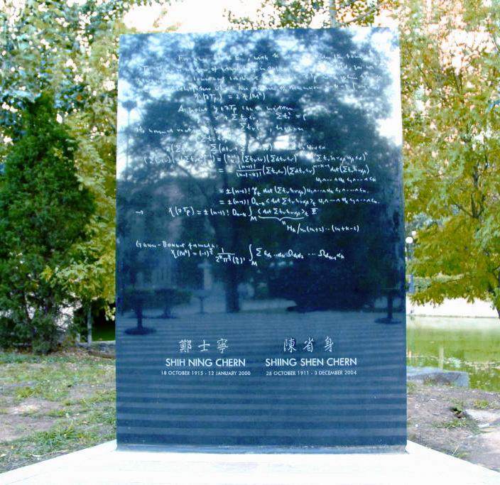 改革开放以来,陈省身非常关心中国数学事业的复兴,亲自参与、组织、指导我国数学界开展学术交流和学术活动,抱着使中国成为数学大国的理想信念,于1985年创办南开数学研究所,培养了大批青年数学家。为缅怀陈省身的爱国情怀和不朽功绩,南开大学在校园内为他树立了一块形似黑板的墓碑(图24)。墓碑高2.1米,横截面为曲边三角形,近似于陈省身代表性论文中的几何图案,墓碑上雕刻着著名的高斯-博内-陈公式。简约的造型表达了陈省身的遗愿:让自己的墓碑成为“户外课堂”的黑板。