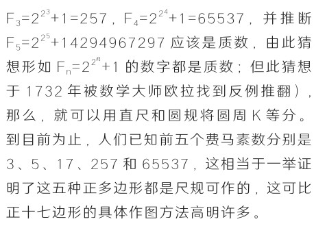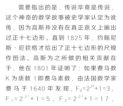 正三角形和正五边形早已为人熟知,而正257边形、正65537边形由于过于复杂,迄今为止尚无人能有所进展。因此,正十七边形自然成为高斯传说中的最佳数学背景。