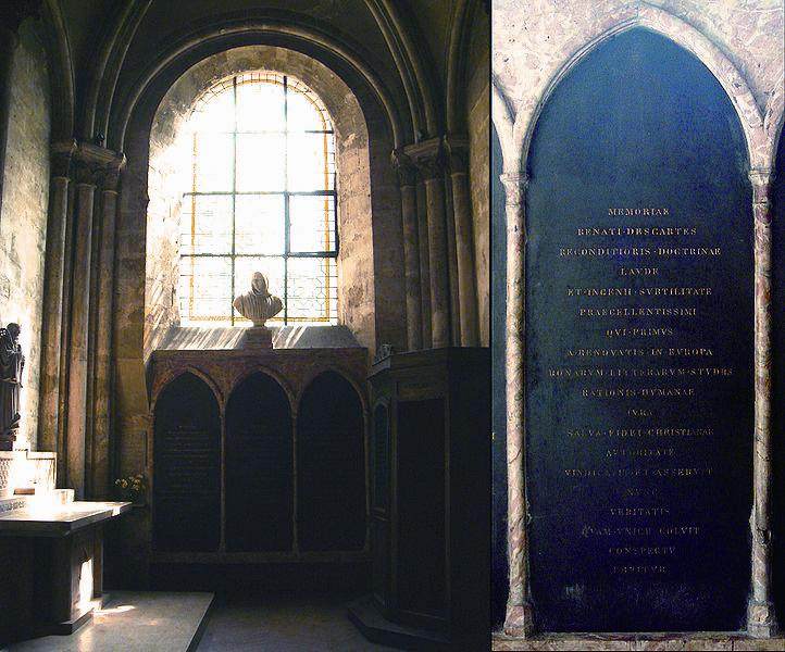 笛卡尔去世后,他的著作被罗马教廷列为禁书,直到1740年,禁令才被解除。1819年,笛卡尔的骨灰被移入巴黎最古老的教堂—圣日耳曼德佩教堂中,在他的墓碑(图18)上,刻着这样一句话:“笛卡尔,欧洲文艺复兴以来,第一个为人类争取并保证理性权利的人。”