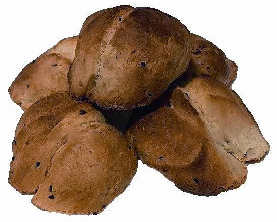首先将五种配好的原料加水搅拌揉成面团,待发酵八九个小时后,将其搓成大小相等的圆团子,四个一组,连成一排。再用刀将排好的面团切成两半,将不规则的两面按住相粘,便成成品。