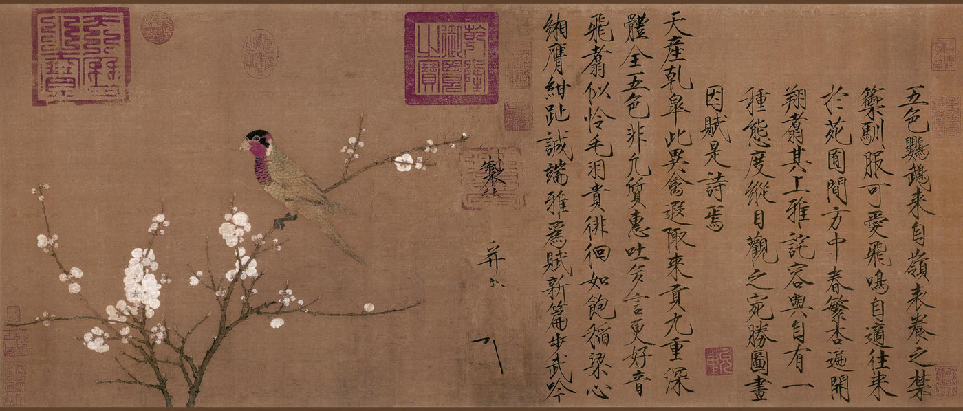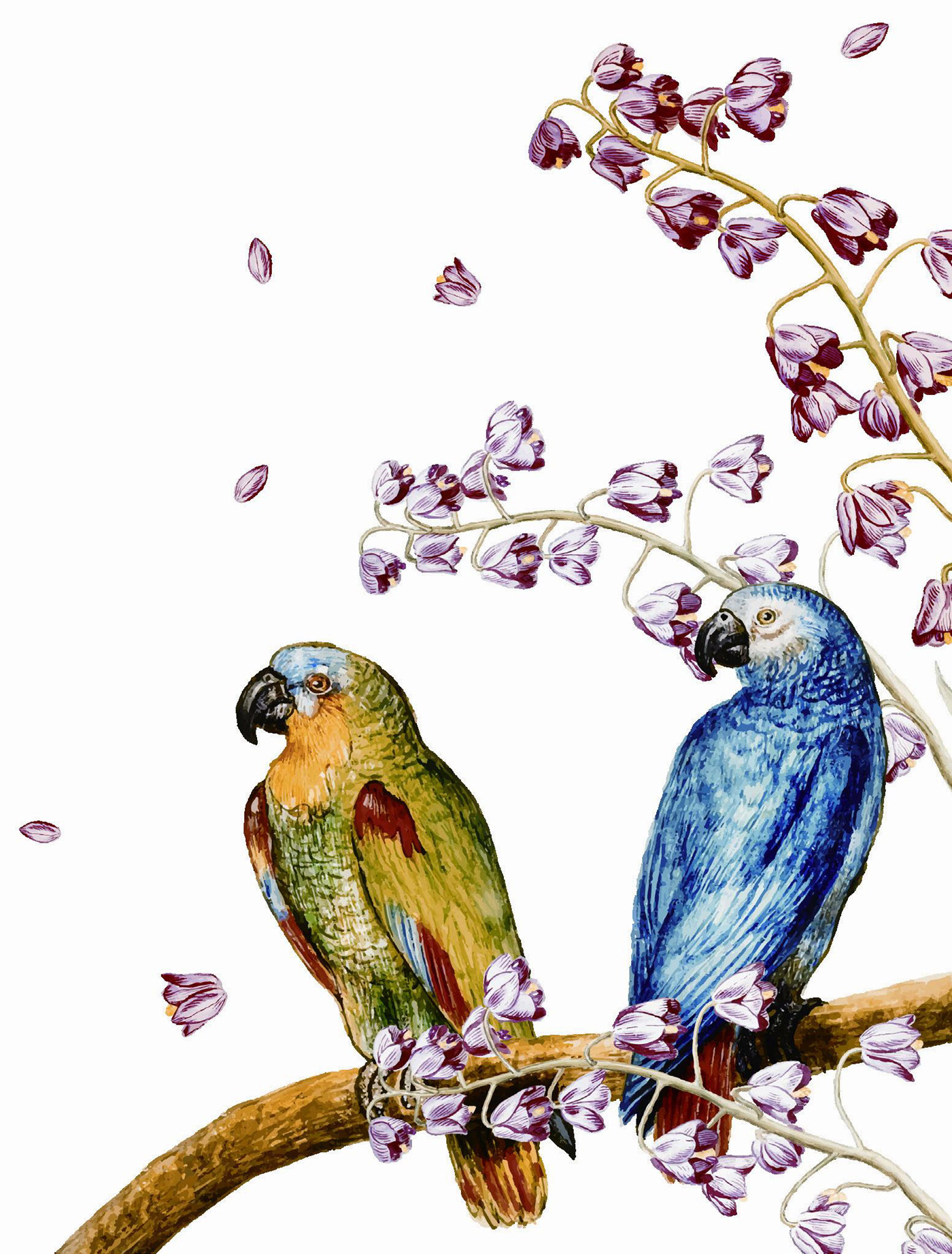 从大地域环境看,越靠近热带,鹦鹉的色彩越是艳丽。三国时所著《外国传》中说:“扶南(今中南半岛柬埔寨、越南一带)东有涨海,海中有洲出五色鹦鹉。”唐代诗人白居易在《红鹦鹉(商山路逢)》中夸赞越南进贡的鹦鹉色彩艳美:“安南远进红鹦鹉,色似桃花语似人。”北宋徽宗赵佶在《五色鹦鹉图》的题跋中写道:“五色鹦鹉来自岭表,豢之禁籞,驯服可爱,飞鸣自适,往来于苑囿间。”除了颜色更繁复鲜亮,五色鹦鹉还比绿尾鹦鹉更容易驯化。明代诗人屈大钧在《五色鹦鹉》 诗中写道:“来自扶南胜陇西,勤教红豆饲中闺。”诗人通过对比陇山鹦鹉,凸显南国鹦鹉的聪慧机敏。