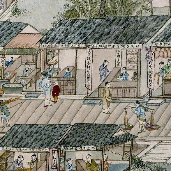 现藏于法国国家图书馆的《苏州市井商业图册》是一本描绘明末清初苏州市井商业与风俗人情的图册,现存36幅图。其中一幅中就画有一家售卖各种花露的店铺,店门口的招牌幌子上写着:天禄号各种自制花露。