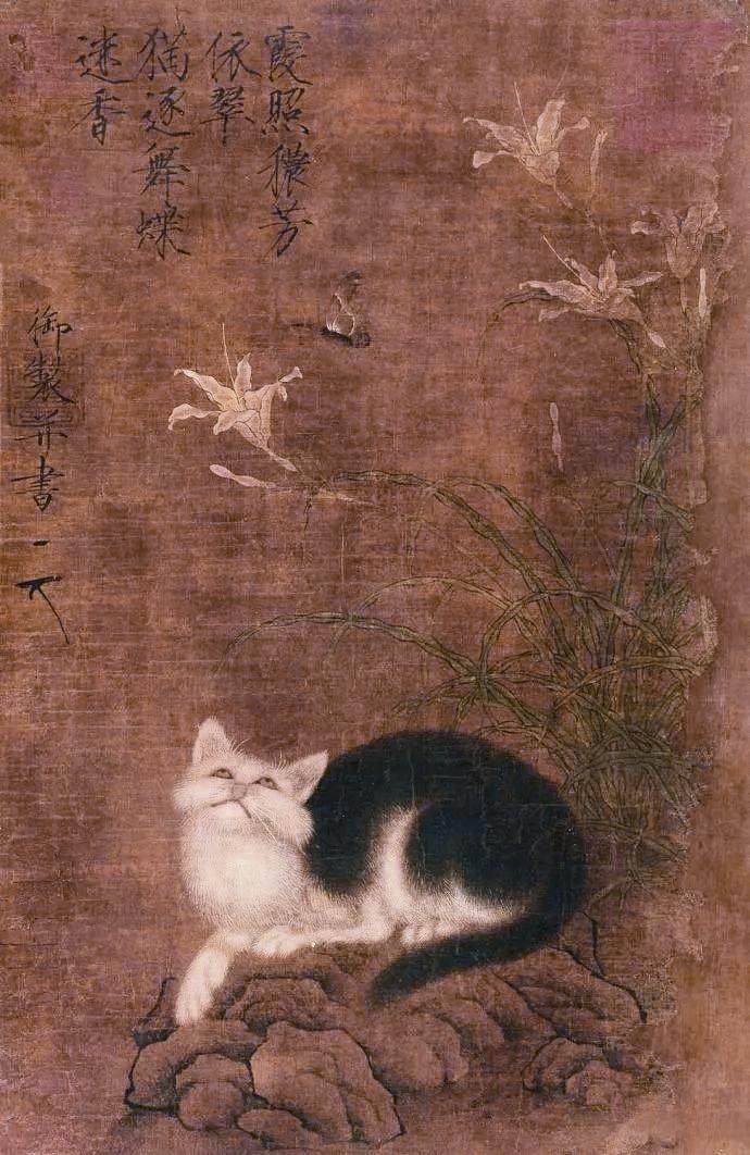 出于对猫的喜爱,古人常将猫的形象融入自己的画作或日常生活所用的物品中。其中,以“猫蝶图”最为流行,“猫”谐音“耄”,“蝶”音同“耋”,“猫蝶”即为耄耋,意为长寿。历史上著名的书画皇帝宋徽宗赵佶曾创作过一幅《耄耋图》,画面中一只黑白相间的小猫匍匐在赏石之上,目不转睛地盯着一只绕花飞舞的蝴蝶。在画面的左上角,有宋徽宗用其创作的瘦金体题写的“霞照浓芳依翠,猫逐舞蝶迷香”。