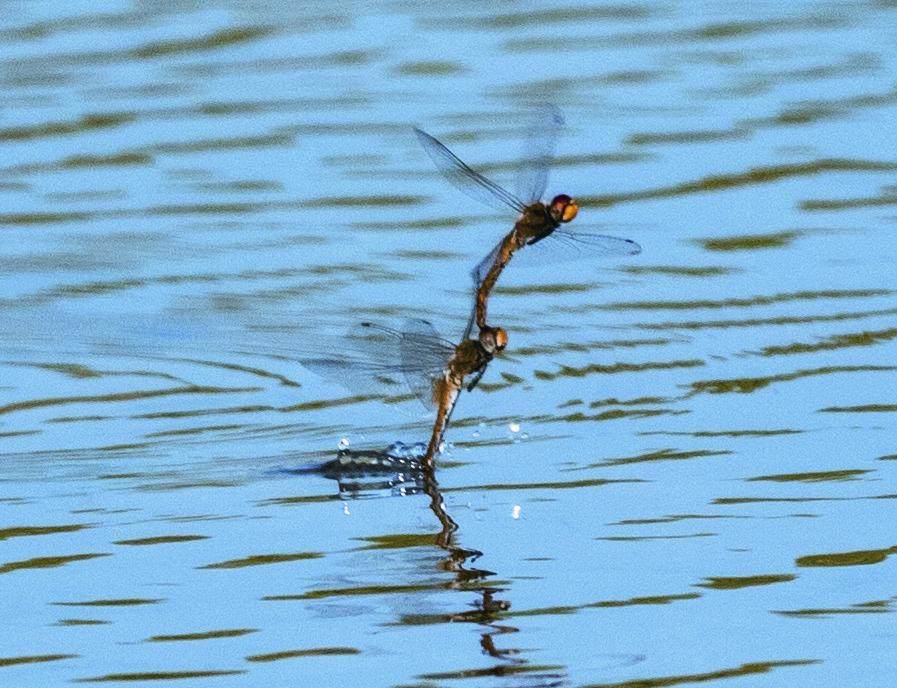 交尾结束后,雌蜻蜓很快就会产卵。这时,有的雄蜻蜓会继续和雌蜻蜓连在一起,并奋力拖着它前往合适的水域产卵;有的雄蜻蜓虽然不会继续和雌蜻蜓连在一起,但也会一直跟在一旁。你以为它是在不离不弃地守护伴侣吗?不。它是担心伴侣再和其他雄蜻蜓交尾,所以一直跟着,以确保雌蜻蜓所产的后代都是这次交尾的成果。