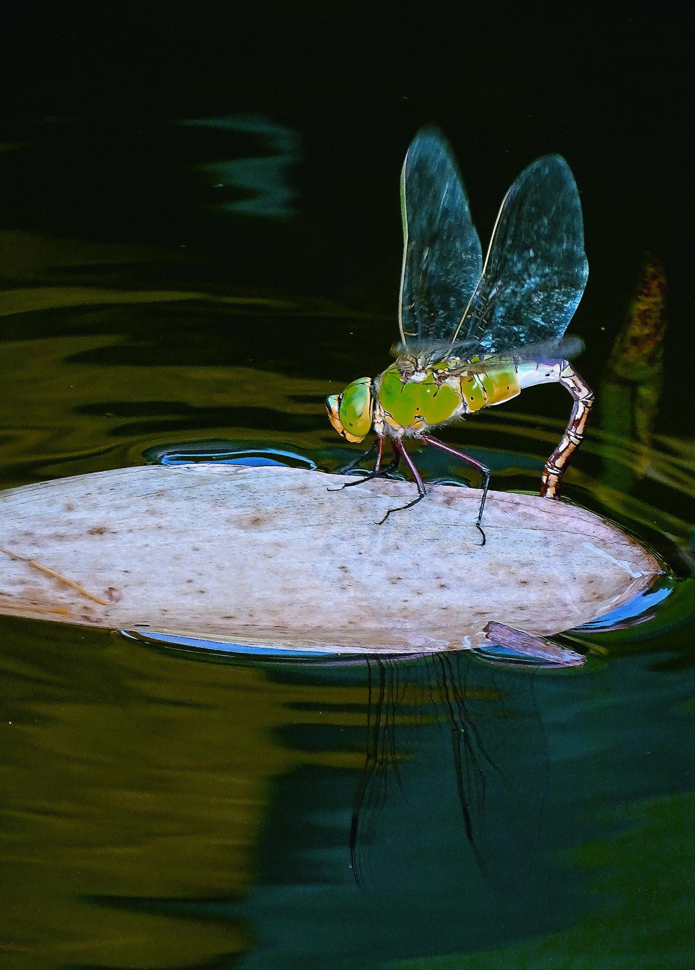 交尾结束后,雌蜻蜓很快就会产卵,即人们常说的“蜻蜓点水”。不过,并非所有蜻蜓都以点水的方式产卵。比如碧伟蜓会攀附在水草上,蜷曲腹部,将腹部的一半浸入水中,让产卵器在水下产卵。为了使受精卵有更多的存活机会,有些雌蜻蜓会沿着水草潜入水中,将尾部刺入水生植物的茎秆,把卵产在茎秆中。这些雌蜻蜓会借助翅膀上的气泡所携带的氧气而呼吸,以确保能长时间浸在水中以完成艰难的产卵任务。
