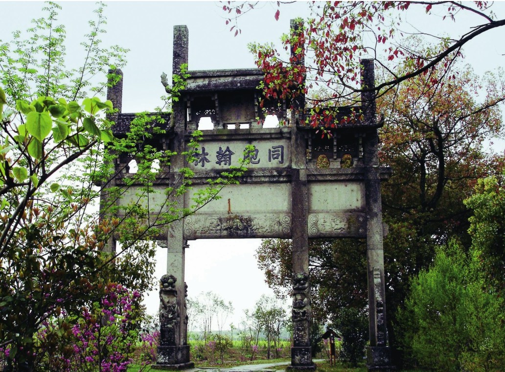 与沙堤亭相距30米、同样骑路而建的是一座四柱三门冲天式青石牌坊,这座被视为村中荣耀的牌坊建于清康熙年间,是为旌表许承宣、许承家这对同胞兄弟在康熙十五年(1676年)和康熙二十四年(1685年)接连高中进士并被钦点为翰林而恩准建造,人称“同胞翰林坊”。在徽州有谚:“天下牌坊数徽州,徽州牌坊一座半。”“一座”是指位于歙县城中的许国八角石牌坊,“半座”就指“同胞翰林坊”。该牌坊高12米、宽9.6米,次间立柱两边为石鼓,明间立柱两边为蹲狮,在龙凤板上刻有“恩荣”二字,明间额坊上东面刻“圣朝都谏”,西面刻“同胞翰林”。通体采用茶园石筑成,其上布满精美的石雕,在石柱间还刻有梅花,取“梅花香自苦寒来”之意。整座石坊华丽风雅,保存完好,堪称徽州牌坊的经典之作。
