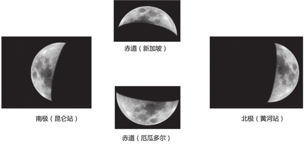 赤道和两极地区看到的月亮也不一样(见图5)。以上弦月为例,在东半球的新加坡(位于赤道附近),月亮看起来像是一个倒扣着的碗;而在西半球的厄瓜多尔(位于赤道附近),月亮则呈现一个正放着的碗的形状。在位于极地地区的中国北极黄河站,月亮看起来与北京的类似,弦在左,弓背在右;在位于南极地区的中国南极昆仑站,月亮则与黄河站的相反,弦在右,弓背在左。