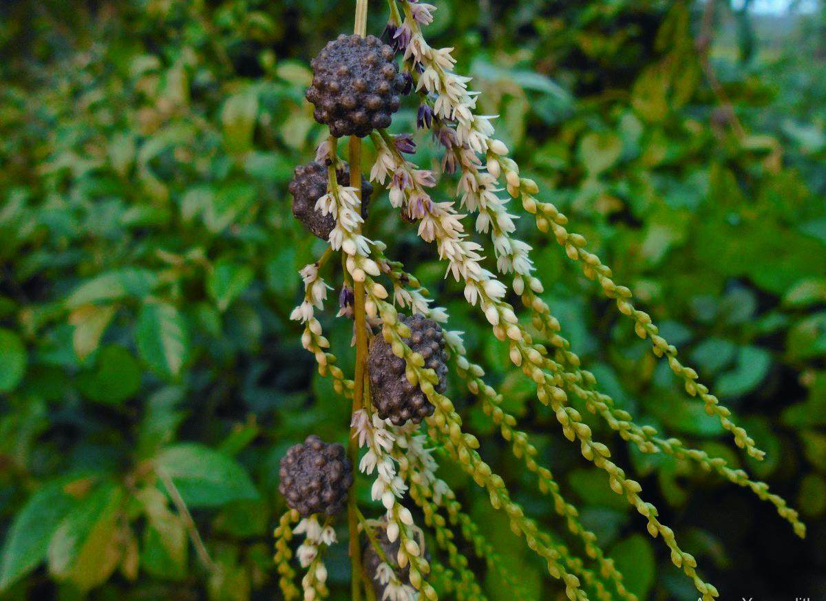 除了上述植物形态特征之外,黄独还有一点特别有趣:在其盘旋而上的茎蔓叶腋中,会结出一颗颗大小不等、玲珑可爱的小“果实”。这些球形或卵圆形的小果子表皮呈紫棕色,上面布满了细密的圆形斑点,就像一颗颗挂在藤蔓上的山药豆,煞是可爱。其实,这些小果子并不是黄独的果实,而是它的珠芽。这是一种变态的腋芽,也就是侧枝的变形,是未能发育成功的球茎,故一般称为“地上块茎”,属于营养繁殖的器官,落地后即能发育成新的个体,可用来繁殖新的植株。这种有趣的珠芽还有一个独特而形象的名字—“零余子”。