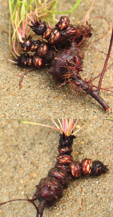 除了叶片多变外,酢浆草属植物的地下部分也千变万化。挖出后,细细探究,便会发现,它们都具有肉质鳞茎状或块茎状根茎,其上分布着酢浆草真正的根系。仅仅用文字清晰描述酢浆草的根茎,大家可能很难理解;如果将酢浆草的形态和我们常见的蔬菜根茎类比,会更加直观。