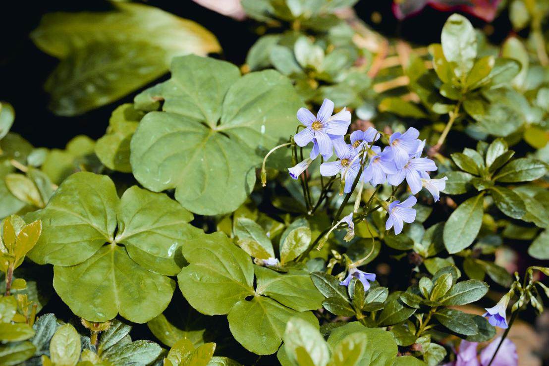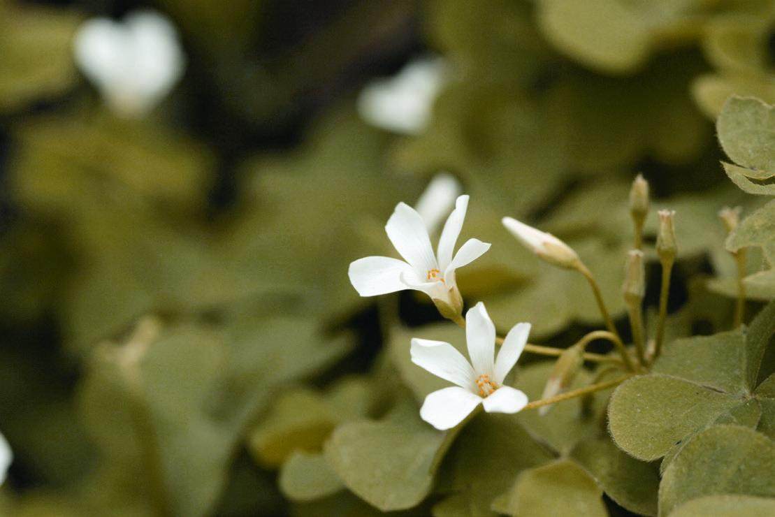 酢浆草属植物的叶片很别致,其地上部分植株长有大量的指状复叶,通常是3枚小叶完美对称,有的似心形,有的像倒置的鸡蛋,还有的为三角形,其形状、颜色或花纹各具特色。也因此,多数酢浆草有着“三叶草”的别名,可见其三小叶的形象已深入人心。当然,也有一些品种更为标新立异,像是叶片犹如棕榈的棕榈酢浆草、叶色形似火山熔岩的熔岩酢浆草等,都受到酢浆草爱好者的追捧。