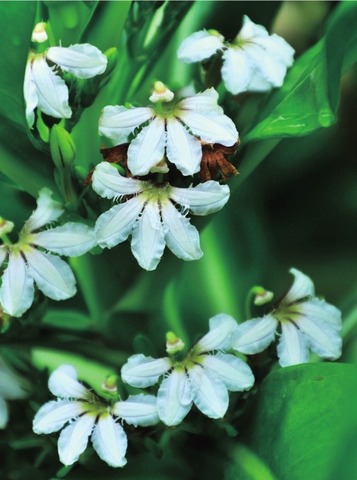 草海桐科的草海桐在这一带的礁石上颇为常见。这Bfm3j7djB9K2iP/TKh3t5M0/iHxS9FR8RNjzLUwv7j0=种灌木广布于太平洋和印度洋热带海岸,抗风、抗旱、耐盐碱,是热带海岸的先锋物种,并可在大多数植物望而却步的海岸礁石环境中成为优势物种。草海桐可高达4米,由于缺乏土壤,这一带的草海桐普遍不及腰高。它们的叶片稍呈肉质、倒卵形,终年开花,花朵洁白,花瓣有5枚,呈扇形排列,看起来似乎被人生生摘除了花朵的另一半。