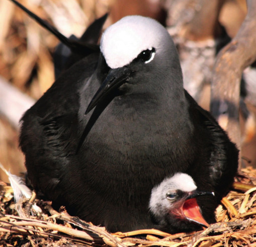 在浪涛声中还夹杂着隐隐鸟鸣,一些灰黑色身影在海面上掠过,立于一根较大的海蚀柱上。沿小径走到一处海崖边,这里是距那根海蚀柱最近的地方,可以俯瞰一大群鸥科鸟类—玄燕鸥。这根海蚀柱不仅是一座孤岛,而且下部陡峭,即使有人乘船靠近也很难登岛,看来玄燕鸥选择在这里安家是很有道理的。三三两两的玄燕鸥在海蚀柱上栖息,它们体长约36厘米,翼展可超70厘米,不过由于距离较远,它们看起来体形显得不大。顾名思义,玄燕鸥浑身呈灰黑色,头顶为白色,这种体色和落满白色鸟粪的黝黑玄武岩背景几乎融为一体。玄燕鸥分布在全球热带和亚热带海域,尤以太平洋海域为多。它们主要以鱼类和乌贼等海洋动物为食,和褐鹈鹕等扎入水中觅食的鸟类不同,玄燕鸥觅食时贴着海面飞行,用长喙快速衔起水中猎物。