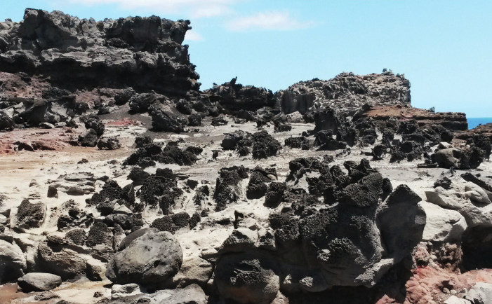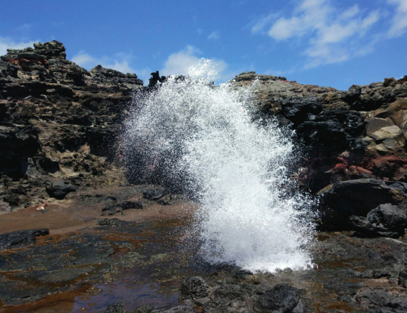 在公路旁停好车,走到可以俯瞰纳卡勒勒的山崖旁,这里高出海平面至少四五十米。突然,海边的礁石上喷起一股水雾,宛如巨鲸换气,那便是喷泉洞。和怀阿纳帕纳帕州立公园相比,这里更具野性,没有专门的小径。我们依地势在岩石上选择路线,向低处进发。这里的环境颇为干旱,看不到一棵树木,仅有稀疏的草本植物,且越靠近海平面越荒芜。这一路上,我们最后看到的植物是番杏科的多肉植物—海马齿,它极耐干热和高盐环境。