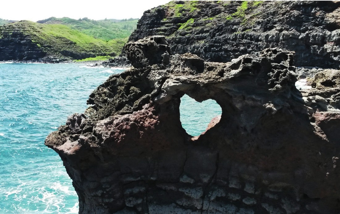 好在怀阿纳帕纳帕仍旧阳光灿烂。这里地处一个小海湾中,海风习习,虽然日头正高,但在树荫下静坐还是觉得太凉了些。循着阵阵涛声,我们向海边走去。小径明显下行,太平洋终于露出了真容,椰子等热带海滨的典型植物也闯入了眼帘。这一带为礁石海岸,基岩是哈雷阿卡拉火山曾经喷出的熔岩冷凝后形成的玄武岩,这种玄武岩含硅质较少,颜色黝黑。我们向一个伸入太平洋的小半岛行进,脚下的小径比海面高出了两三层楼的高度。在这里行走可要留点心,不仅仅是因为高度,而是在浪潮长年累月的冲蚀下,海平面附近的玄武岩被淘蚀出了许多空腔,在地理学中它们被称为海蚀洞。一些海蚀洞的顶部已塌陷,在小径旁留下了不少形状、大小都不规则的开口,从中传出沉闷的浪涛拍击声,别有洞天。