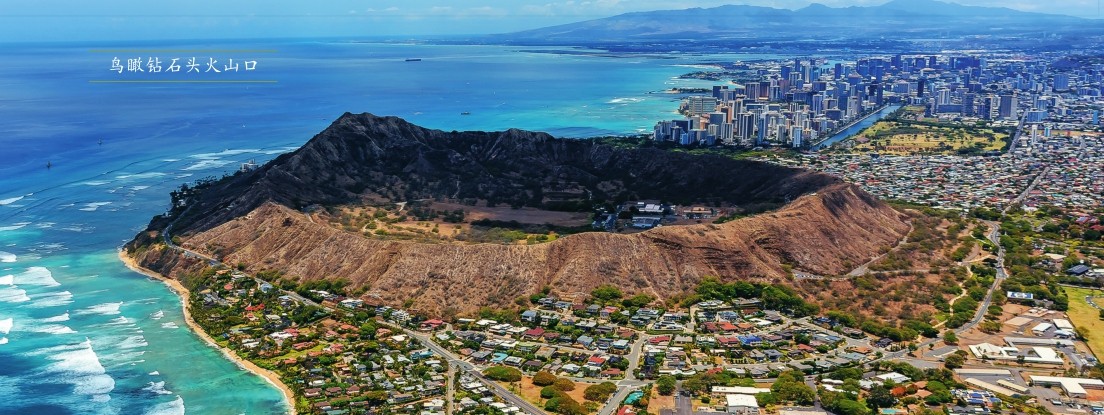 乘机离开毛伊岛,仅过了半小时,夏威夷首府火奴鲁鲁(檀香山)所在的瓦胡岛便出现在机窗右侧。一座几乎浑圆的火山口矗立在一片摩天大楼和沙滩右侧,这便是著名的钻石头火山口。驻足于火奴鲁鲁人潮涌动的威基基海滩,你几乎不可能错过钻石头火山口的身影,它俨然成了火奴鲁鲁乃至夏威夷的地标之一。从这里看去,钻石头火山口的山顶并不是平的,右侧较高,极似金枪鱼的背鳍,因此它便有了“金枪鱼海角”这一形象的夏威夷语名称。据说19世纪时,英国水手见其山坡上有闪闪发亮的晶体,以为是钻石,其实这些晶体不过是碳酸钙,但“钻石”一名沿用至今。