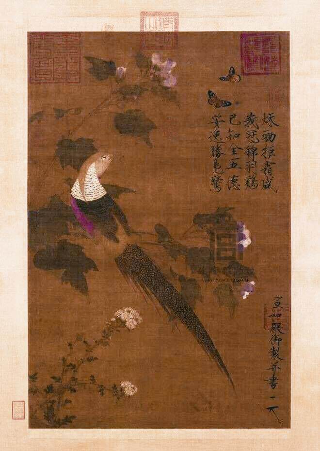 作为宋徽宗传世代表作之一,《芙蓉锦鸡图》充分显示了他扎实的绘画功底。宋徽宗用精细的线条勾勒出锦鸡羽毛的质感和生长方向,大胆地采用艳丽的颜料展现锦鸡亮丽的羽毛,突出作为珍禽的锦鸡精致端庄的特点。画面中,站在枝头的锦鸡被蝴蝶吸引,其回头注视的神态也吸引着观者的视线。此外,画中的芙蓉和菊花采用折枝法加以描绘,分别置于画面的上方和左下方,形成鲜明的对比。画面右下方有落款—“宣和殿御制并书”,并钤印花押“天下一人”。画面右上方以瘦金体题诗:“秋劲拒霜盛,峨冠锦羽鸡。已知全五德,安逸胜凫鹥。”细细品鉴,会发现这幅画上的落款诗和画作本身似乎没有多大的联系,更像是为了突出锦鸡与“五德”的联系。