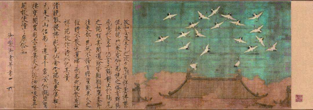 在绘画方面,宋徽宗博采众长,在工笔花鸟、山水、建筑、人物等多个领域均有突出的成就。尤其在工笔花鸟画方面,更是成绩斐然,传世代表作有《瑞鹤图》《芙蓉锦鸡图》《腊梅山禽图》《祥龙石图》《五色鹦鹉图》《溪山秋晚图》等。宋徽宗不仅重视写生,而且研究物理法度,笔下的花鸟形神兼备、意趣盎然。据说有一次,外国使节向宋皇室进贡孔雀,宋徽宗召集宫廷画师一起欣赏、写生。在此期间,宋徽宗突然问了一个问题:“孔雀上台阶时先抬哪只脚?”众人面面相觑,宋徽宗淡淡地说道:“左脚。”大家仔细观察孔雀上台阶时的行为,果然正如宋徽宗所说的那样,孔雀每次都是先抬左脚。