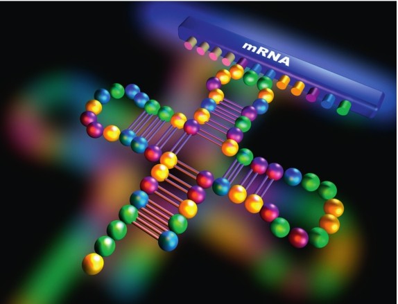 RNA主要包括mRNA、tRNA和rRNA三种,其中mRNA又名信使RNA,因为mRNA是细胞核中转录脱氧核糖核酸(DNA)的信使。DNA和mRNA都有核苷碱基,即遗传密码。DAN的4个碱基是A、T、G和C,而mRNA的4个碱基是A、U、G和C,对应DNA中的4个遗传密码。