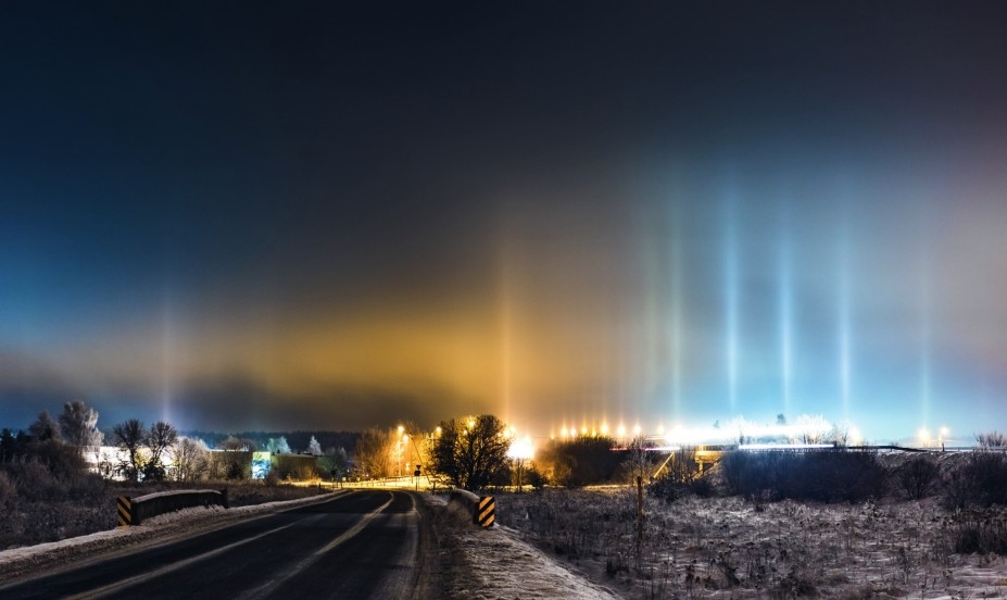 除了冰晶,寒夜灯柱的主要贡献者中还包括人造光源;否则,即使冰晶在天地之间形成了“幕布”,缺少照射光源,也无法产生寒夜灯柱。