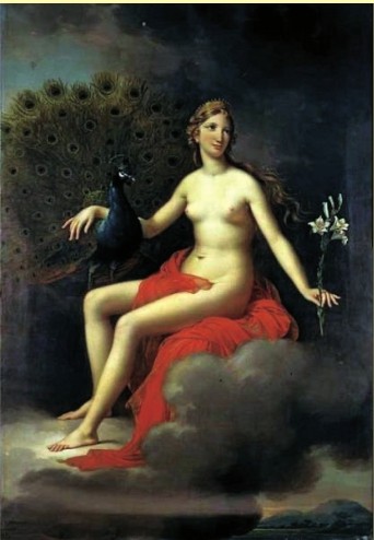 在早期西方历史中,人们对来自东方的孔雀有着截然相反的态度。有人认为孔雀是优雅、富贵的象征,有人则认为孔雀骄傲自大,是典型的“不祥鸟”。在古希腊神话中,天后赫拉的仆从“百眼巨人”阿尔戈斯被赫尔墨斯杀死后,一只羽毛像鲜花般艳丽、尾巴像帆船一样展开的鸟从他的血迹中生长出来。为了纪念自己的仆从,赫拉将巨人的所有眼睛都安放在这只鸟的尾羽上,这只鸟就是孔雀。所以在《希腊神话手册》一书中,孔雀被视为“天后赫拉的爱鸟”。在古罗马神话中,女神朱诺也十分喜爱孔雀。如在比利时画家约瑟夫·佩林克创作的油画中,女神朱诺的右手就在轻抚一只开屏的孔雀。