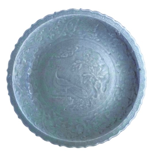 在英国伦敦大不列颠博物馆95号展厅“中国瓷器”专馆中,收藏了自3世纪以来的众多中国精品瓷器,其中瓷器“孔雀青釉大餐盘”别具一番风味。与周围陈列的牡丹刻花等静物盘碗不同,该盘高6.4厘米,直径51厘米,底部中央为一只单足站立在一块岩石之上的孔雀,它尾翅收拢,正回首翘望身旁的牡丹。动静结合的盘底构图与内壁轻盈的缠枝莲纹相得益彰,大大减少了胎体厚重带来的粗笨感。专家鉴定认为,这件孔雀餐盘为14世纪晚期浙江龙泉窑所产,在15世纪初经海路来到英国。