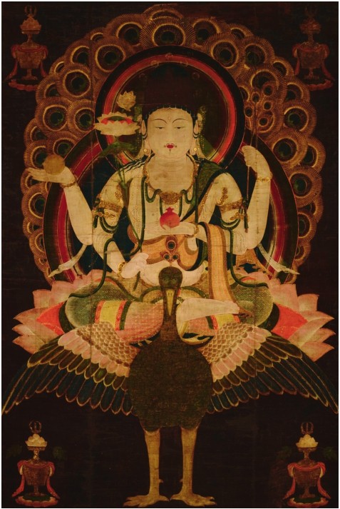 除了文字记载,孔雀图像艺术也在这一时期旅行到日本。根据日本学者的研究,东京国立博物馆目前所藏的《孔雀明王像》正是沿袭了空海(774—835年)唐代时由中国带回日本的孔雀明王构图。除了空海,在贞观四年至七年(862—865年)访唐的僧人宗叡带回的经典文物中,《孔雀明王经》与孔雀明王画像也详列在其所撰写的《新书写请来法门等目录》里。