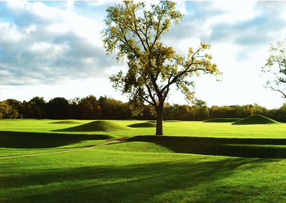 此刻的土丘城中仅有笔者一人,天地间一片寂静。光影摇曳间,眼前似乎浮现出霍普韦尔人在此祭祀的场景。云母、铜、银、珍珠和贝壳闪闪发亮,悠扬而神圣的歌声飘向辽远的天际。