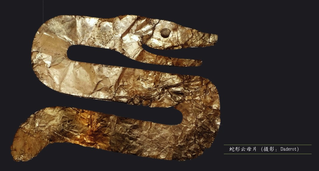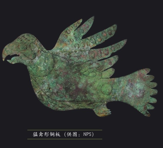 光线昏暗的展区中,一件件文物在聚光灯下分外抢眼:黝黑的火山玻璃制成的精美而对称的长矛矛头、线条简洁而形象生动的乌鸦形和青蛙形烟斗……笔者对其中泛着铜绿的铜制品尤感兴趣。一块平坦的铜板被刻成飞鸟形状,鸟的上喙向下弯曲,这可能是鹰隼等猛禽的形象。它的翅膀在身后高高扬起,尾部微张,足收于身下,活脱脱一幅振翅飞翔的画面。铜板上用线条刻出眼睛和羽毛等,翅上还刻有环形花纹。除了这样的平面铜质物件,还有立体的铜头饰。其中一件头饰为野猪形,“野猪”的头部、躯干、四肢和尾巴一应俱全。“野猪”头部占全身比例甚大,双耳向前微微耷拉,嘴部张开,口鼻部分较长,眼睛镂空,神情颇为凌厉。