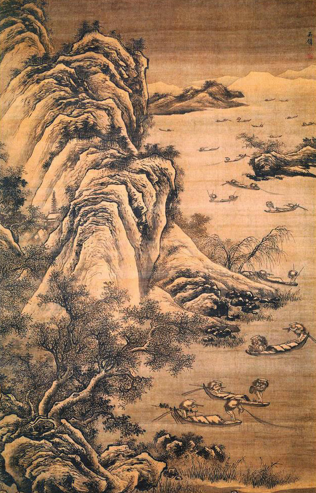 《江雪》的描述极有层次,历代诗人无不交口称绝,丹青妙手也争相以此为题,绘出不少动人的江天雪景图。日本东京国立博物馆收藏的宋代画家马远绢本水墨画《寒江独钓图》,据说就是依据“独钓寒江雪”创作的。类似之作还有元代姚廷美的《雪江渔艇图》(北京故宫博物院藏)、明代吴伟的《雪江捕鱼图》(湖北省博物院藏)乃至张大千等近现代著名画家的一些画作。其画面构图多为一望无际的白茫茫雪野,一叶小舟静静停泊在弯弯江水中,舟上只见一锥影放长线一钩—意为渔翁独钓寒江之雪。