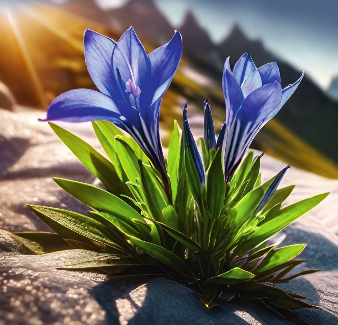 龙胆之所以有娇艳的花朵,不仅是为了吸引传粉者,也与高原恶劣的自然环境有关。高原自然条件恶劣,“传粉信使”的种类、数量和活动能力都因此而显著降低。美丽的龙胆花能吸引体壮多绒毛的熊蜂为自身传宗接代。此外,高原上空气稀薄,紫外线异常强烈,为了减少紫外线对自身的伤害,龙胆花的花瓣中产生了大量的花青素,以吸收紫外线,防止花瓣被灼伤。大量的花青素让龙胆花变得极为醒目,呈现出或深或浅的蓝色,部分龙胆花还呈现出粉红色、紫色和白色。它们一株株,一片片,或疏离错落,或密集如织,紫蓝交辉,在皑皑白雪的衬托下,分外娇艳。